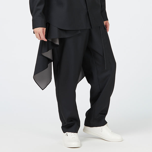 付属ベルトの両サイドに付いたフレアー布が、構築的で美しいシルエットを表現します。