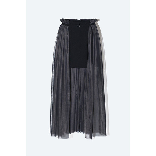 タイトなミニスカートにシアー素材の長丈スカートをレイヤードさせた立体的なデザインです。