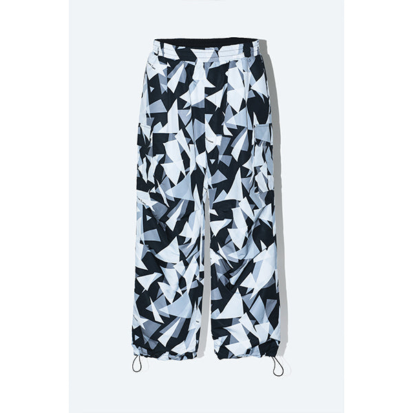 表面は、重なり合う三角形をモノトーン系の濃淡で表現し、ロゴをミックスしたオリジナルのプリントです。裏面は、シンプルな無地のブラックです。