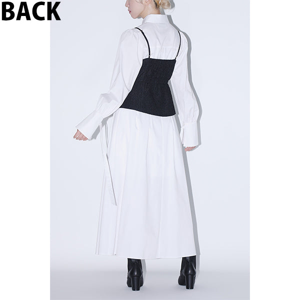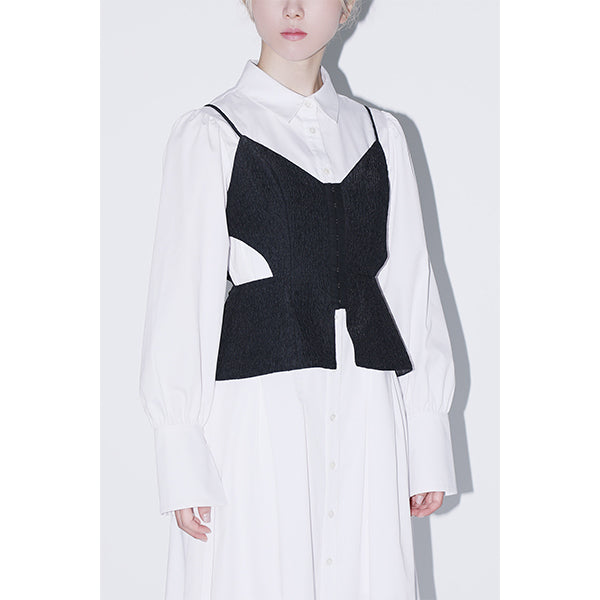 ウエスト部分のカットアウトデザインと、裾にかけて広がるペプラム調のデザインが立体的なシルエットを作り出すデザイン。