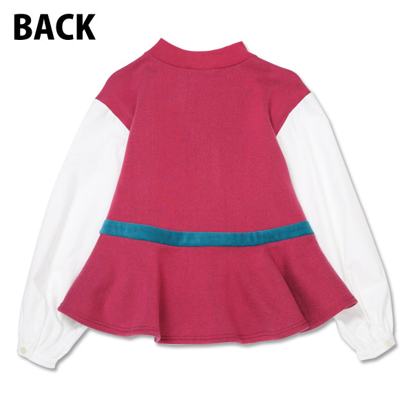 1枚でレイヤード風の着こなしが完成するトップス。裾は動きのあるペプラムタイプで、ちらっと見える裏側のグリーンのカラーがスタイリングのアクセントに。袖部分も適度なボリューム感をもたせてトレンド感を演出しています。