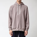 フード紐のロゴがアクセントになっています。オーバーサイズシルエットでもだらしない印象にならない絶妙なシルエットに仕上げました。