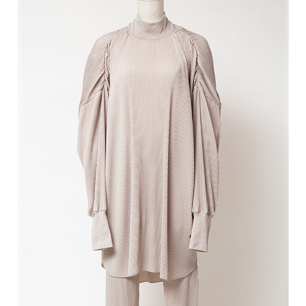 やわらかく、落ち感ある素材にプリーツ加工を施したトップス。