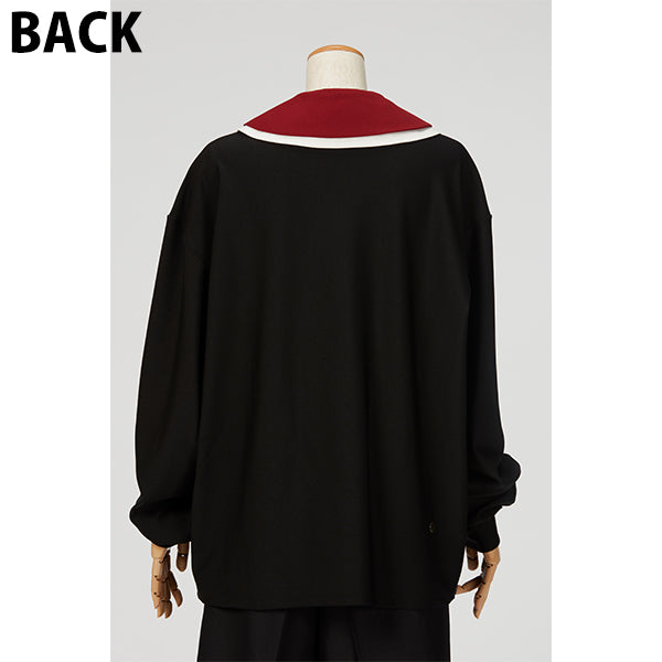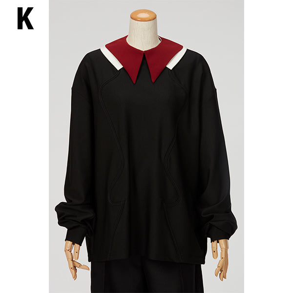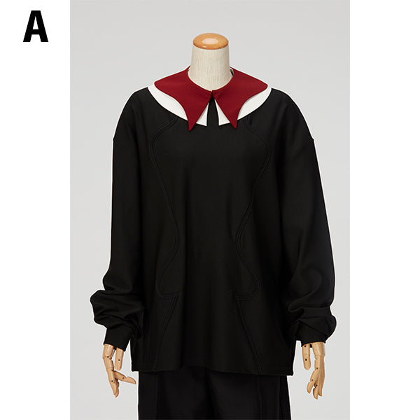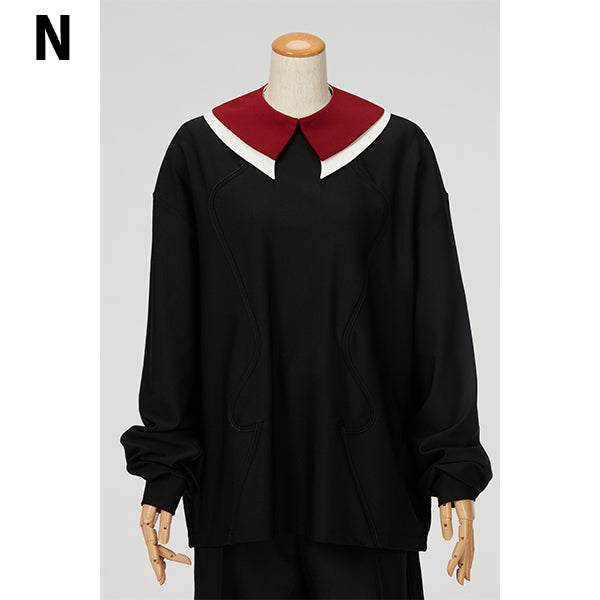 直線と曲線を組み合わせたシャープな雰囲気のフォルムと、ボルドーと白の異素材の重なりのカラーバランスが美しい付け襟です。お手持ちのトップスやワンピースなどと合わせて、スタイリングのポイントとしてお楽しみください。