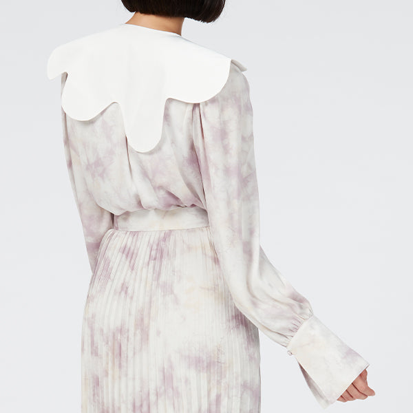 繊細なタッチのニュアンスプリントが施された、上質なサテン素材のブラウス。